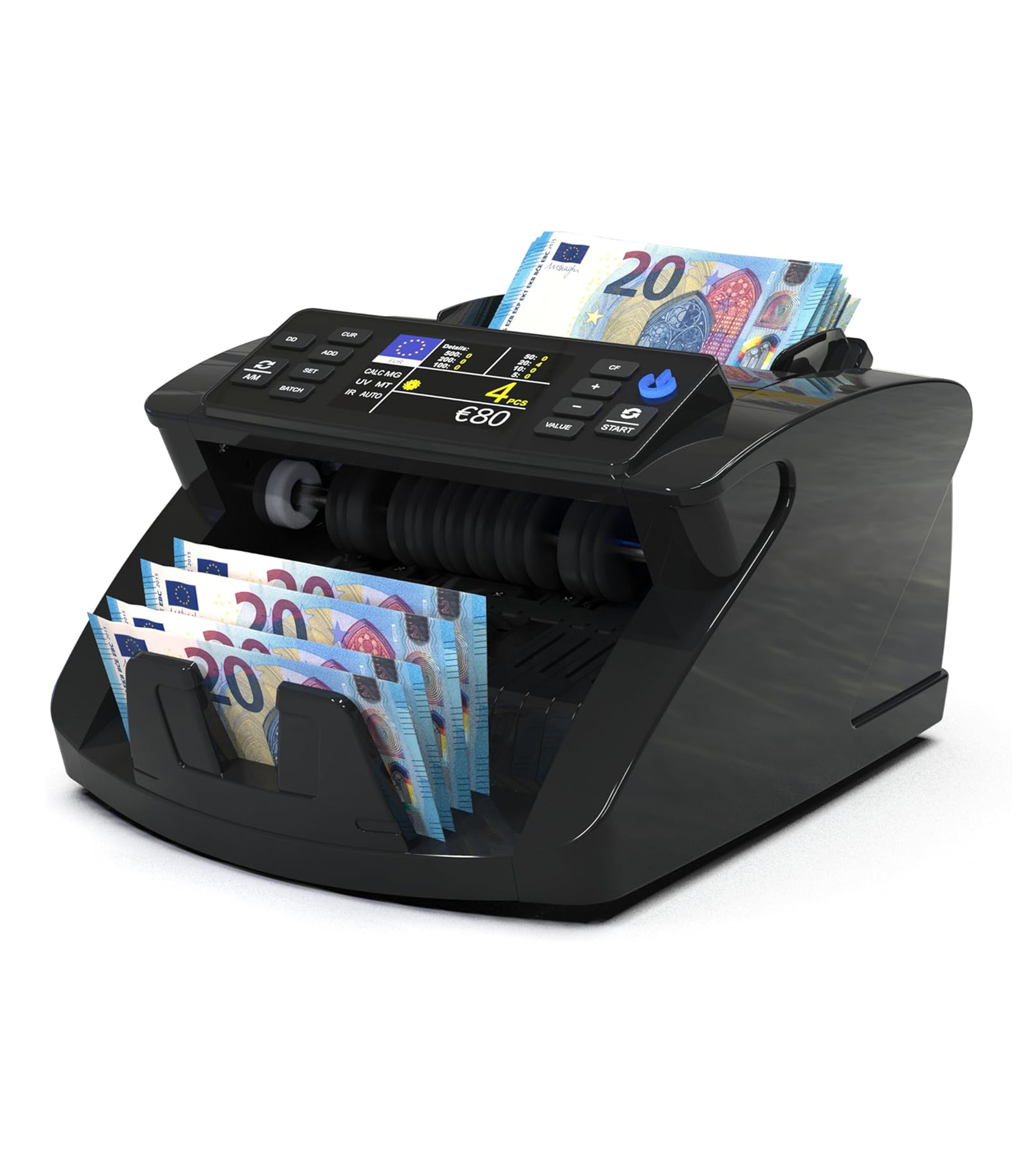 Grazie alle sue alette di contenimento, è possibile caricare fino a 200 banconote contemporaneamente. Senza fermare il conteggio o attendere che la macchina finisca, è possibile anche aggiungerne altre.