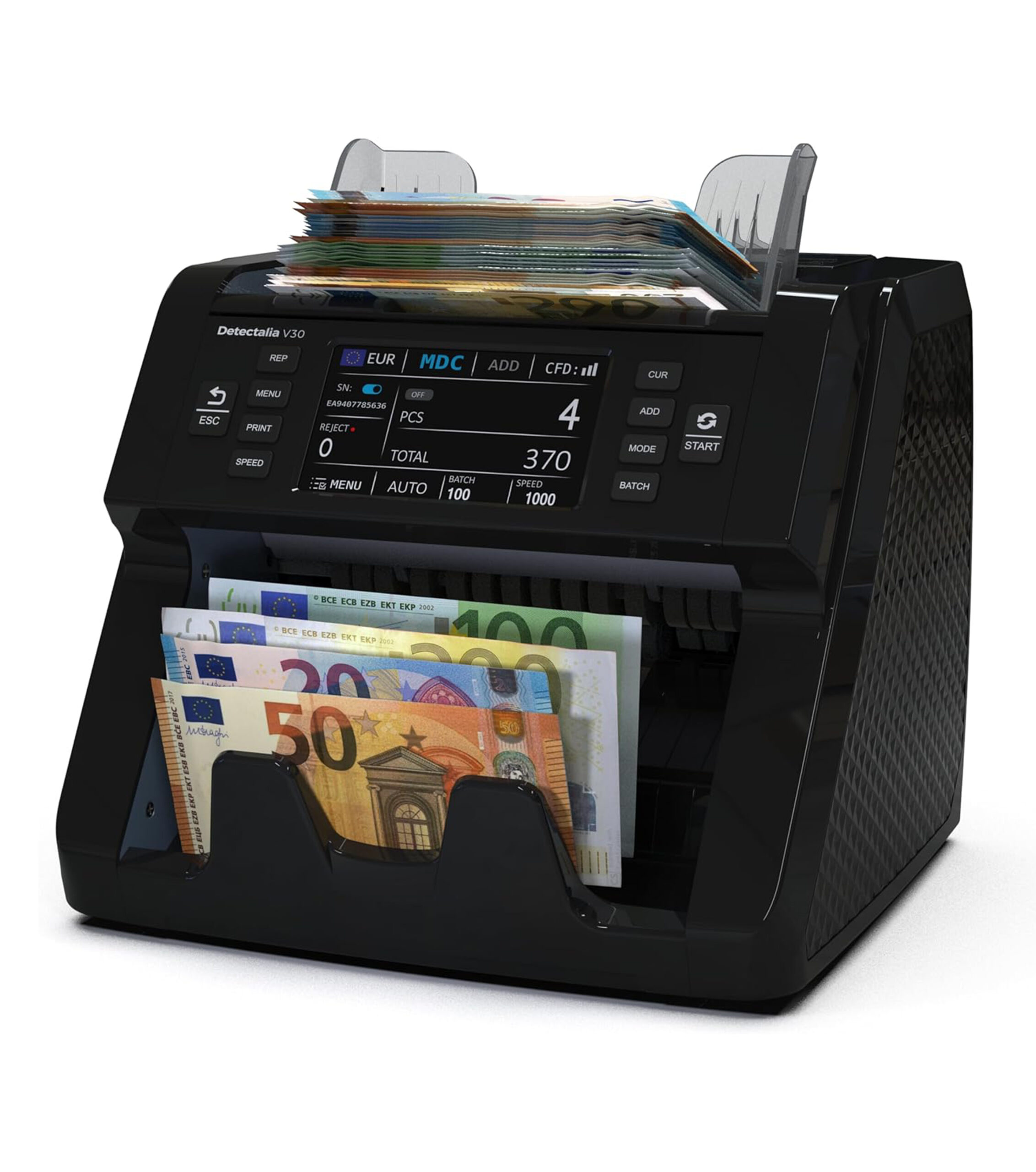 La contabanconote separatrice Detectalia V30 è una macchina di tipo professionale di alte prestazioni per alti volumi di conteggio.